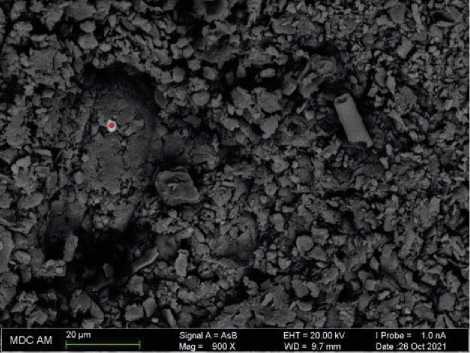 Рис. 7. Электронно-микроскопический снимок доломита (отметка 190 см; ~8164 к.л.н.; атом. % Ca – 2,40, Mg – 1,94; O – 56,57, C – 29,54; Si – 4,37; Al – 1,93, Ti – 1,98, Fe – 1,27)