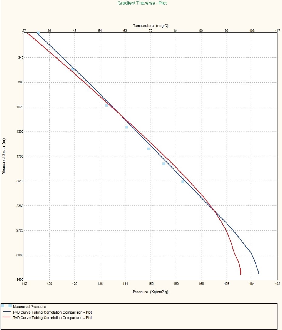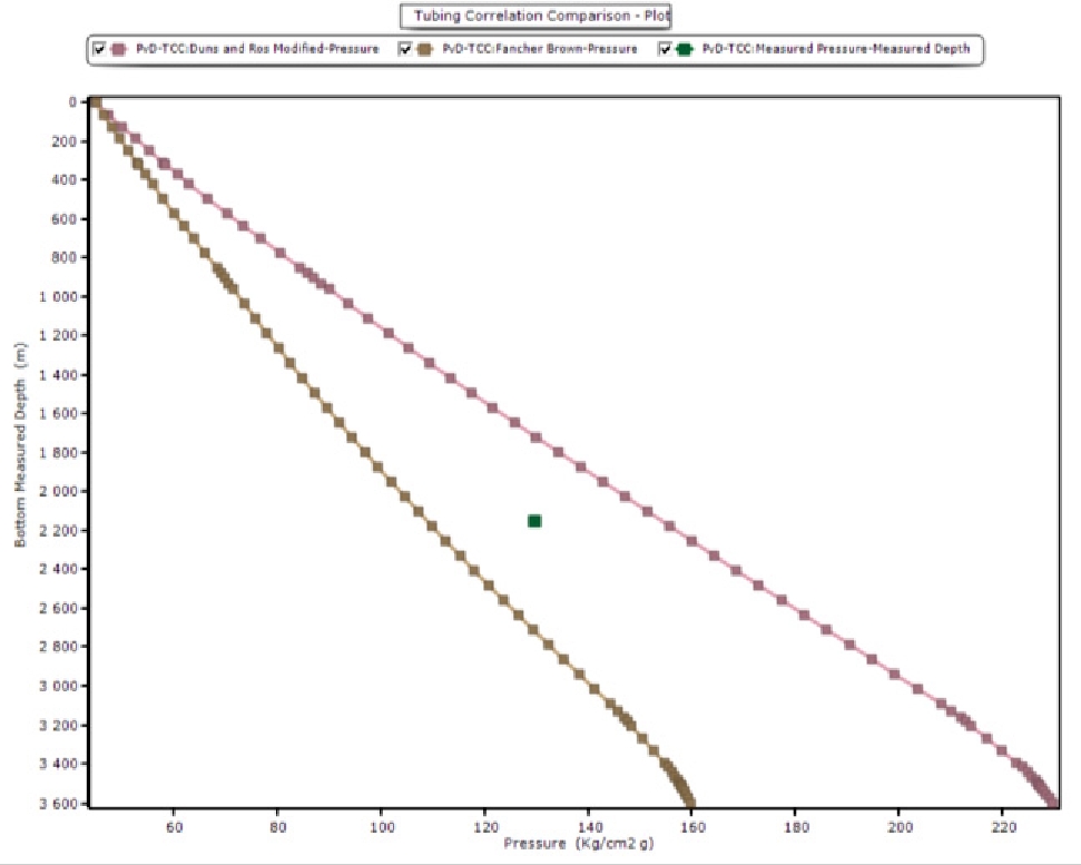На вкладке «Correlation Comparison» выполняется расчёт и построение градиента давления и температуры в скважине для данных на дату актуализации. Для этого вносятся данные о буферном давлении, проценте обводненности, газовом факторе и дебите жидкости. Также немаловажным фактором является выбор правильной корреляции для расчета, которая подбирается опытным путем и обычно является единой для залежей с аналогичными физико-химическими свойствами [3].