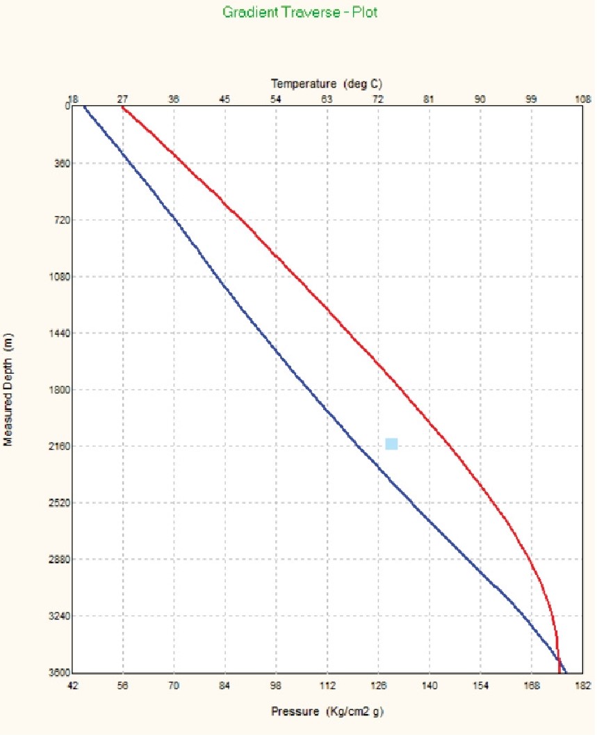 На графике градиента давления визуально оценивается, насколько расчётное значение на приёме ЭЦН совпадает с фактическим (рис. 1). Голубой точкой на рисунке отмечено фактическое давление на приеме ЭЦН, полученное с датчика погружной телеметрии (ТМС). Синяя линия демонстрирует нам распределение давления по стволу скважины.