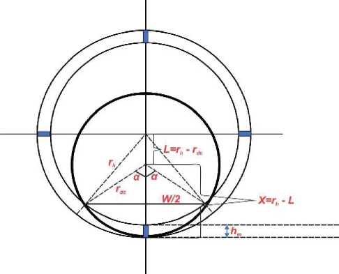 Здесь r – локальный радиус буровой трубы, дюйм; hm – толщина фильтрационной корки, дюйм; rdc – радиус рабочей бурильной колонны, дюйм; 2α – угол расположения трубы.