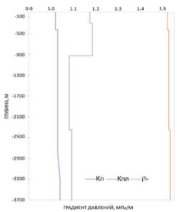 Рис. 3. Градиент давлений на юге Ирака в зависимости от различных значений глубины и плотности раствора при параметрах Kл=1,02–1,09 МПа/м; Кпл=1,1–1,8 МПа/м; ρ0=1,5–1,52 кг/м3