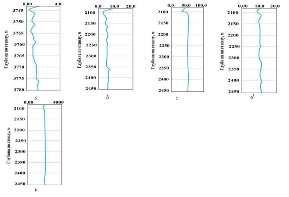 Рис. 6. Скважина В. Информация о прихвате трубы: a–e) характер изменений по глубине ствола скважины следующих параметров: скорости проходки, м/ч (a); нагрузки на долото, кг (b); числа оборотов, c–1 (c); крутящего момента, кН‧м (d); давления в стояке, атм (e)