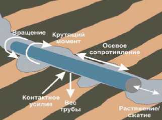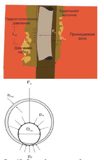 Рис. 10. Гидростатическая и пластовая силы, действующие на бурильную трубу (согласно [13, 16, 21])
