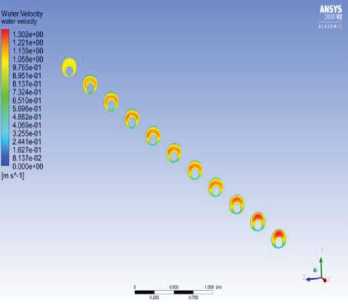 Fig. 16. Change in the axial component of the solution velocity vector along the length of the horizontal section of the well under the conditions: Re=104, L=10 m, R2=0.2 m, R1=0.1 m in sections with an interval of 1 m