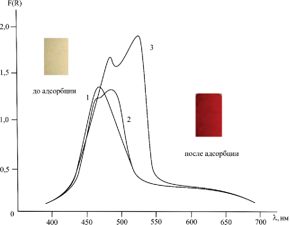 Рис. 1. Спектры диффузного отражения Цеолит-ЭД-20 (1), модифицированного ПАН (2) после адсорбции катиона металла (3), и интенсивность цвета до и после адсорбции