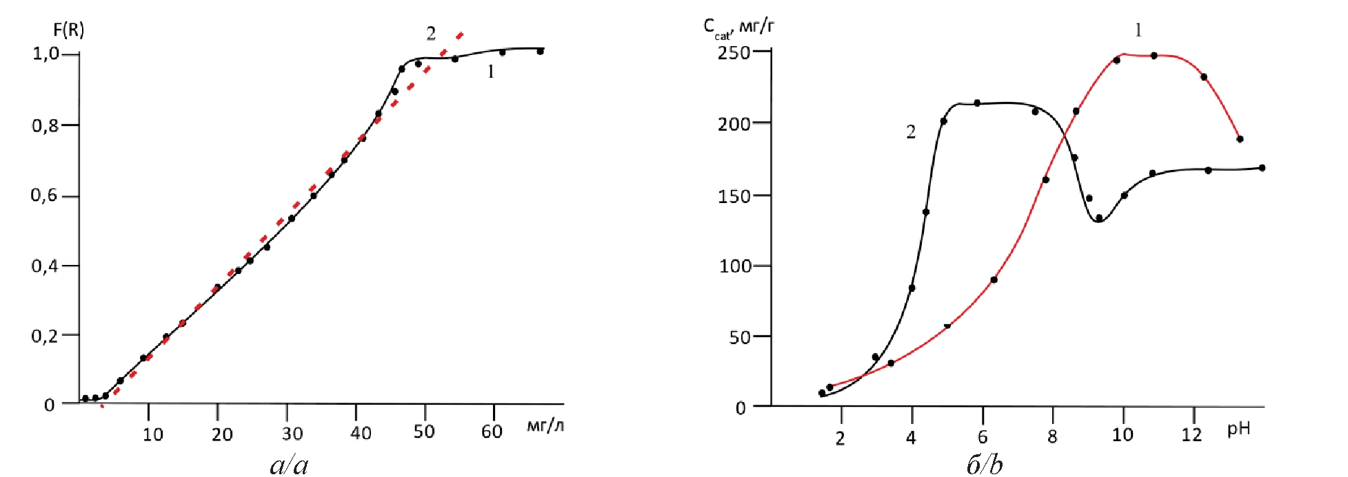 Рис. 3. Экспериментальная (1) и теоретическая (2) градуировочные зависимости (а) и зависимость полноты сорбции исходного цеолита (1) и модифицированного ЭД-20 цеолита (2) от рН (б) при времени контакта 40 минут