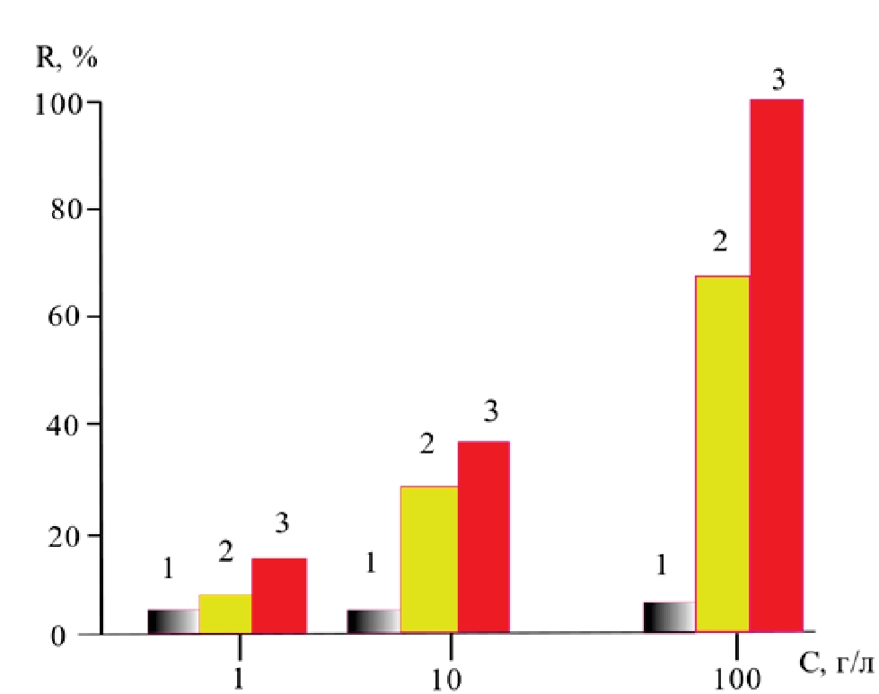 Рис. 4. Степень десорбции (%) ПАН с поверхности Цеолит-ЭД-20 при обработке сорбента растворами NaCl (1), НСl (2) и HNO3 (3)