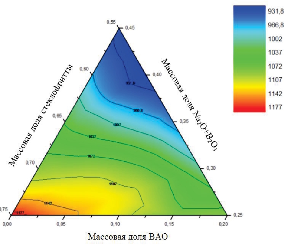 Из рис. 6 видно, что область стекол, у которых вязкость от 50 до 100 дПа∙с (темно-синяя область) при температуре 900 °С, расположена там, где содержание оксидов натрия и бора от 35 до 45 %, стеклофритты – 55 %, ВАО – от 0 до 10 %. Из рис. 7 видно, что область с вязкостью от 35 до 100 дПа∙с (от синей до зеленой области) при температуре 1000 °С расположена там, где содержание оксидов натрия и бора от 30 до 45 %, стеклофритты от 55 до 60 %, ВАО от 0 до 15 %.