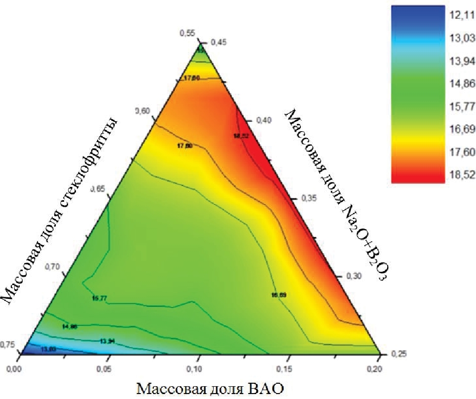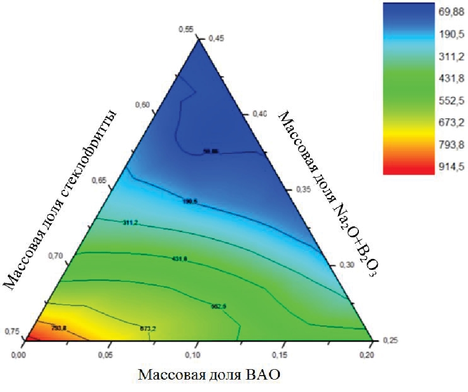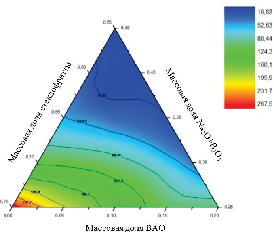 Область с максимальными значениями относительной скорости изменения вязкости в данном исследовании находится там, где содержание стеклофритты от 55 до 65 %, содержание оксидов натрия и бора от 25 до 35 % и содержание ВАО от 10 до 20 %.