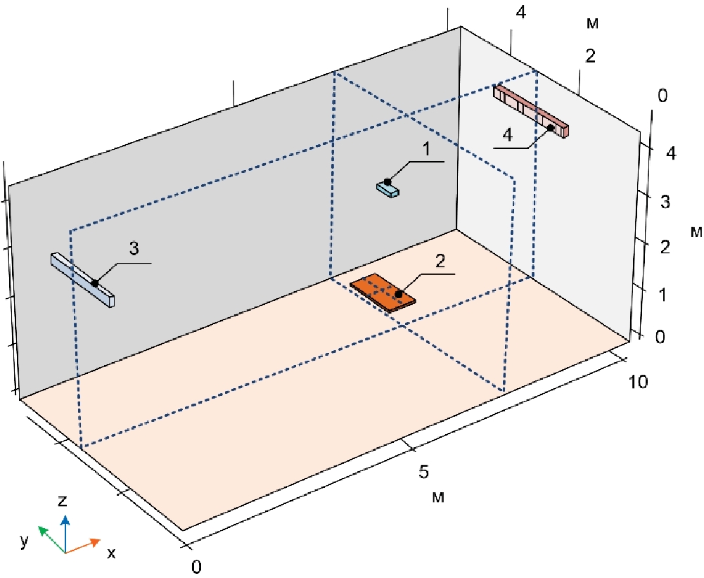 Рис. 1. Схема области решения задачи: 1 – ГИИ, 2 – горизонтальная панель, 3 – зона притока воздуха, 4 – зона оттока воздуха. Пунктирными линиями выделены рассматриваемые сечения