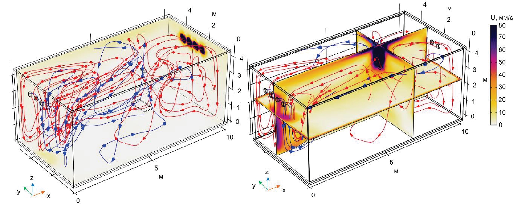 Отмечается согласие в получаемой тенденции формирования нисходящих холодных и восходящих нагретых потоков воздуха, возникающих при теплообмене с поверхностями разных температур (холодных ограждающих конструкций и более нагретой горизонтальной панели). Значительное согласие наблюдается как в номинальных значениях, так и в градиентах скоростей.