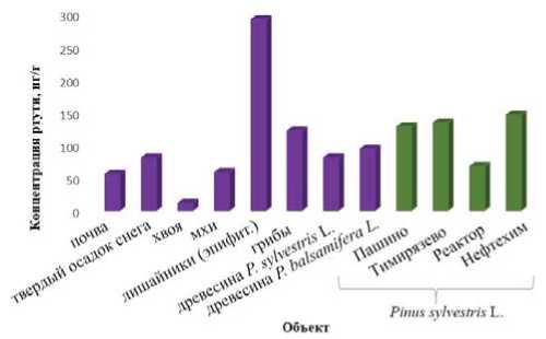 Рис. 3. Содержание ртути в объектах окружающей среды на территории Томского района [5, 6, 9, 26]