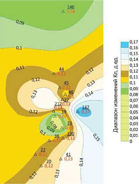 Значения параметра Кпр достигают максимальных отметок 13,5 мД в скважине № 130 и уменьшаются в направлениях на юго-запад и северо-запад (рис. 2).