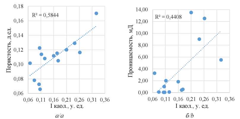 Рис. 4. График зависимости средних значений пористости (а) и проницаемости (б) от интенсивности каолинитизации нижней группы пластов ТП19-20 танопчинской свиты