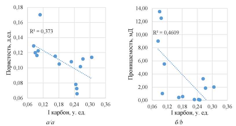 Рис. 6. График зависимости средних значений пористости (а) и проницаемости (б) от интенсивности карбонатизации нижней группы пластов ТП19-20 танопчинской свиты