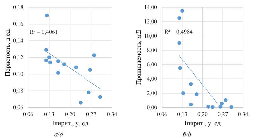Рис. 7. График зависимости средних значений пористости (а) и проницаемости (б) от интенсивности пиритизации нижней группы пластов ТП19-20 танопчинской свиты