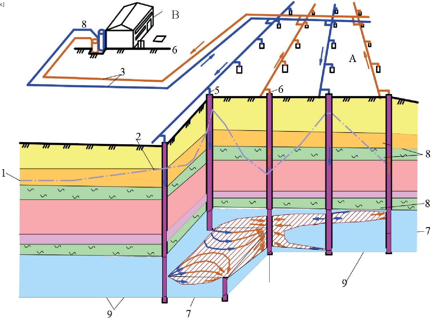 Рис. 1. Участок скважинного выщелачивания: комплексы: А – добычной; В – перерабатывающий; 1 – нижний уровень воды; 2 – верхний уровень воды; 3 – растворопроводы; 4 – цех работы с растворами; 5 – закачные скважины; 6 – откачные скважины; 7 – горная масса; 8 – водоупорный слой; 9 – граница оруденения