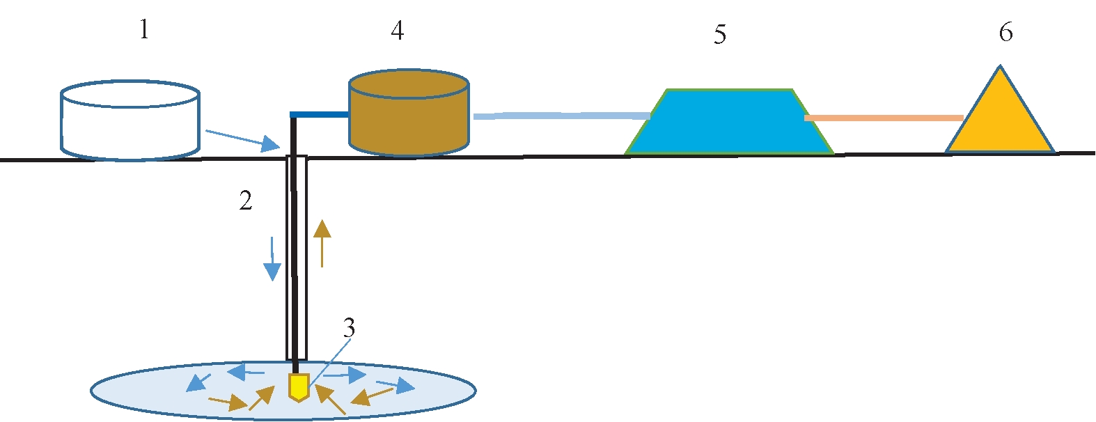 Рис. 2. Схема комбинирования технологий скважинной гидродобычи и кучного выщелачивания: 1 – вода для бурения; 2 – скважина для выдачи добытой руды; 3 –гидромонитор; 4 – узел подготовки руды; 5 – куча руды; 6 – узел извлечения металлов из раствора