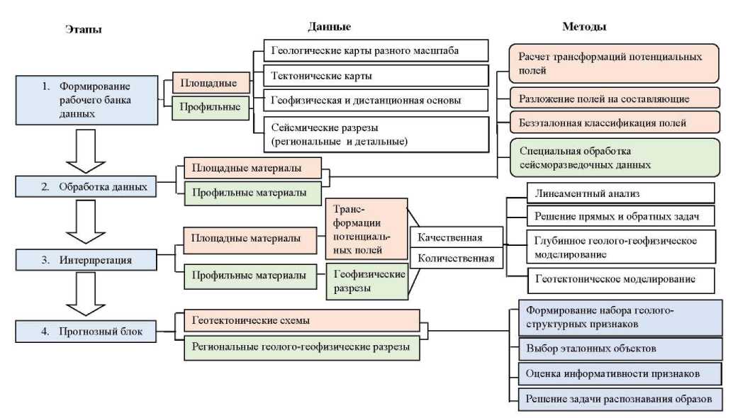 Технологическая схема геолого-геофизического моделирования Змеиногорского рудного района представлена на рис. 1. Она включает четыре основных этапа: создание базы данных, обработку, интерпретацию и решение прогнозных задач.