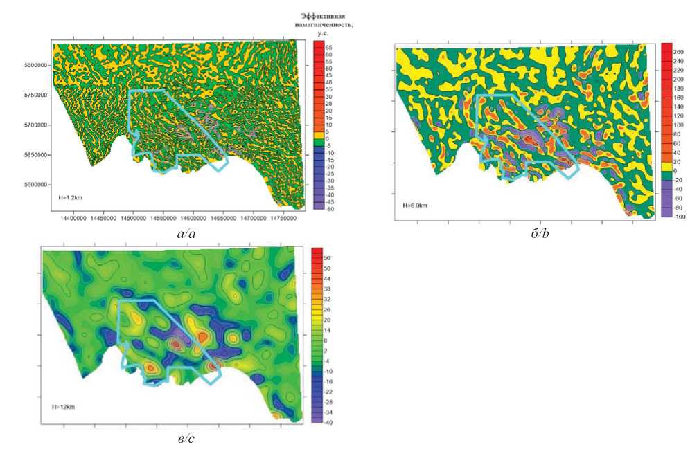 Рис. 2. Трансформанты магнитного поля, рассчитанные с применение алгоритма спектрального разложения. Оценочная глубина «среза»: а) h=1,2 км; б) h=6 км; в) h=12 км (масштаб 1:1000000) [22]. Бирюзовым цветом выделен контур Змеиногорского рудного района [составлено авторами]
