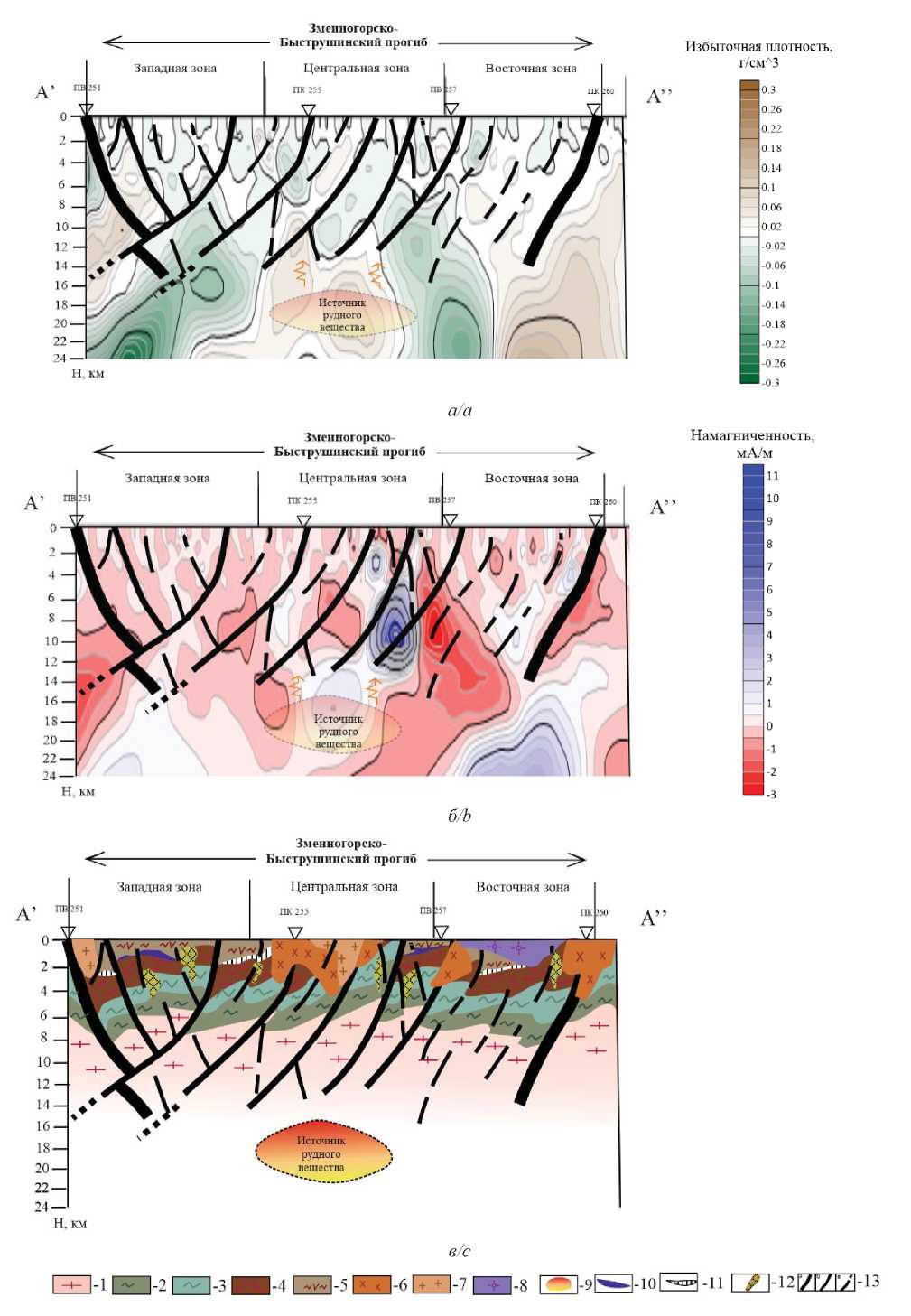 Fig. 6. Manifestation of discontinuities a) on the pseudodensity section constructed by the method of M.B. Shtokalenko [29]; b) on the section of effective magnetization constructed by the same method; c) interpretive geological and geophysical section of the upper crust [compiled by the authors]. Legend: 1–8 – structural and material subdivisions: 1 – granite-gneiss layer of the upper crust; 2–3 – sedimentary formations of the ancient shelf (2 – terrigenous-carbonate (O-S), 3 – flyschoid (S-D1-2); 4 – bimodal basalt-rhyolite, rhyolite-rhyodacite and gabbro-plagiogranite series (D1-2); 5 – volcanogenic-sedimentary deposits of basalt-dacite-rhyolite series (D2-3); 6 – gabbro-granodiorite formation (D3); 7 – gabbro-granodiorite-granite formation (C1); 8 – plumasite-granite formation (T1); 9 – supposed source of ore substance; 10–12 – ore formations (10 – solid cupreous-polymetallic ores, 11 – vein-embedded, 12 – subvolcanic porphyry bodies with nested-embedded mineralization); 13 – discontinuities (a, б – riftogenic (a – main, б –secondary), в – thrust faults, presumably caused by the Hercynian orogeny)