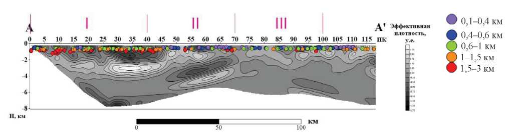 Fig. 5. Pseudo-density section on a fragment of the regional profile of the GSZ-MOVZ "Basalt" [20, 21] with the superimposition of the results of the calculation of singular points (Euler deconvolution) [compiled by the authors]