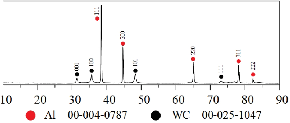 Кроме того, стоит отметить, что пробоподготовка не привела к фазовым превращениям в составе материала. На рис. 2 представлена рентгеновская дифрактограмма подготовленной смеси порошков Al и WC (на примере 15 мас. % WC), показывающая отсутствие в составе различных промежуточных фаз, которые могли бы возникнуть в процессе приложения энергии шаров к частицам порошков. Данный факт обусловлен низким вводом удельной энергии в систему, которая в первую очередь определяется параметрами процесса помола (частота вращения, время, соотношение шаров к порошку, объем формы) [40].