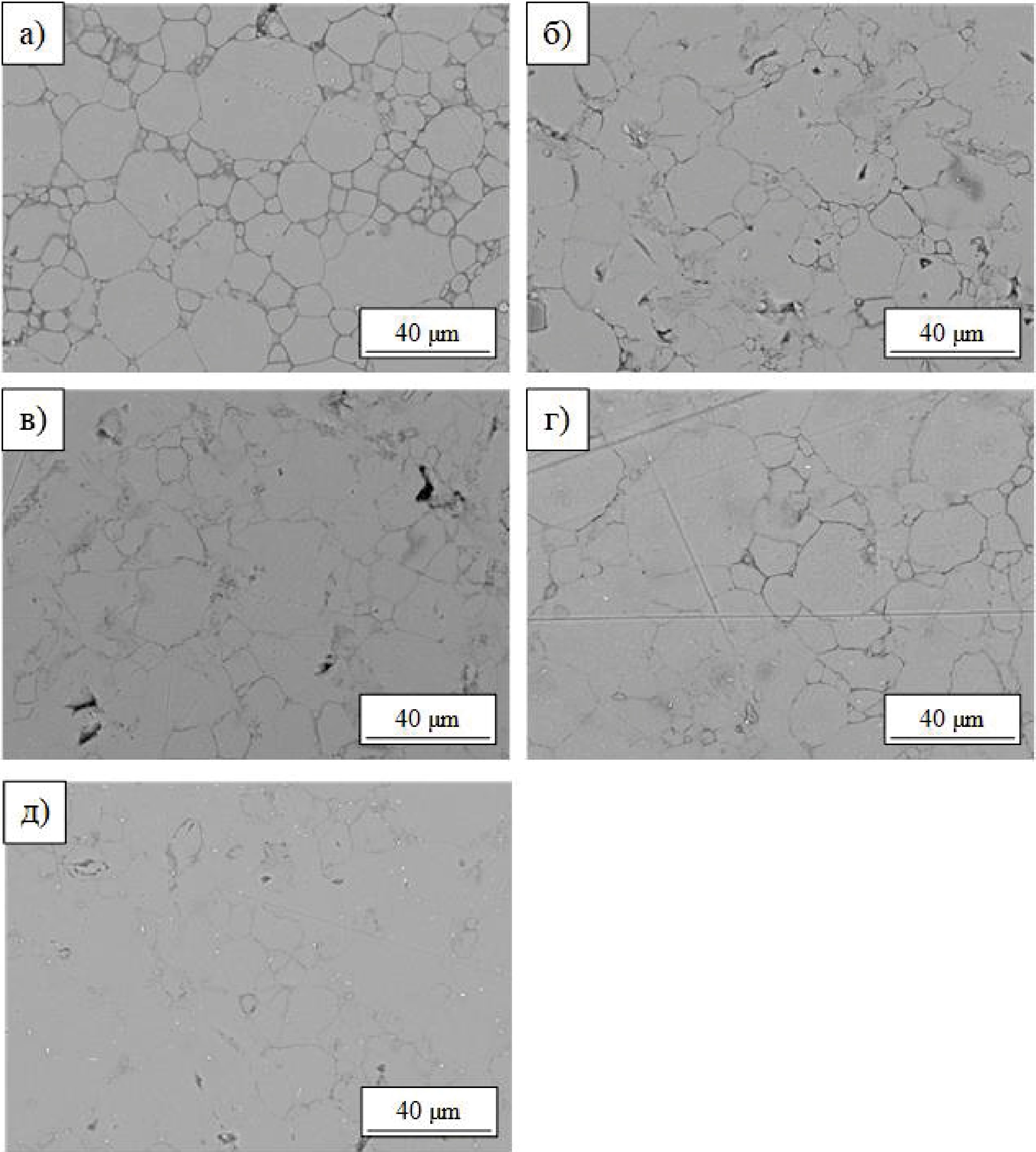 На рис. 3 представлены микроснимки поверхности объемных изделий из чистого алюминия, полученных при разной температуре спекания. Состояние микроструктуры полученных объемных изделий также демонстрирует тенденцию к повышению уплотнения материала при росте температуры спекания. Так, для образца, полученного при TSPS=400 °C (рис. 3, а), при общей достаточно высокой степени уплотнения характерно наличие пор и относительно широких межзеренных границ, в то время как материал, спеченный при TSPS=600 °C, имеет практически беспоровую структуру с едва различимыми (при проведении съемки без травления) границами зерен. Предварительная серия экспериментов продемонстрировала оптимальную температуру спекания TSPS=600 °C (рис. 3, д) для образца из чистого алюминия. Дальнейшее повышение температуры неминуемо приведет к расплавлению основной части материала и его вытеканию из пресс-формы. Этой же температуры можно придерживаться при проведении искрового плазменного спекания композитных образцов.