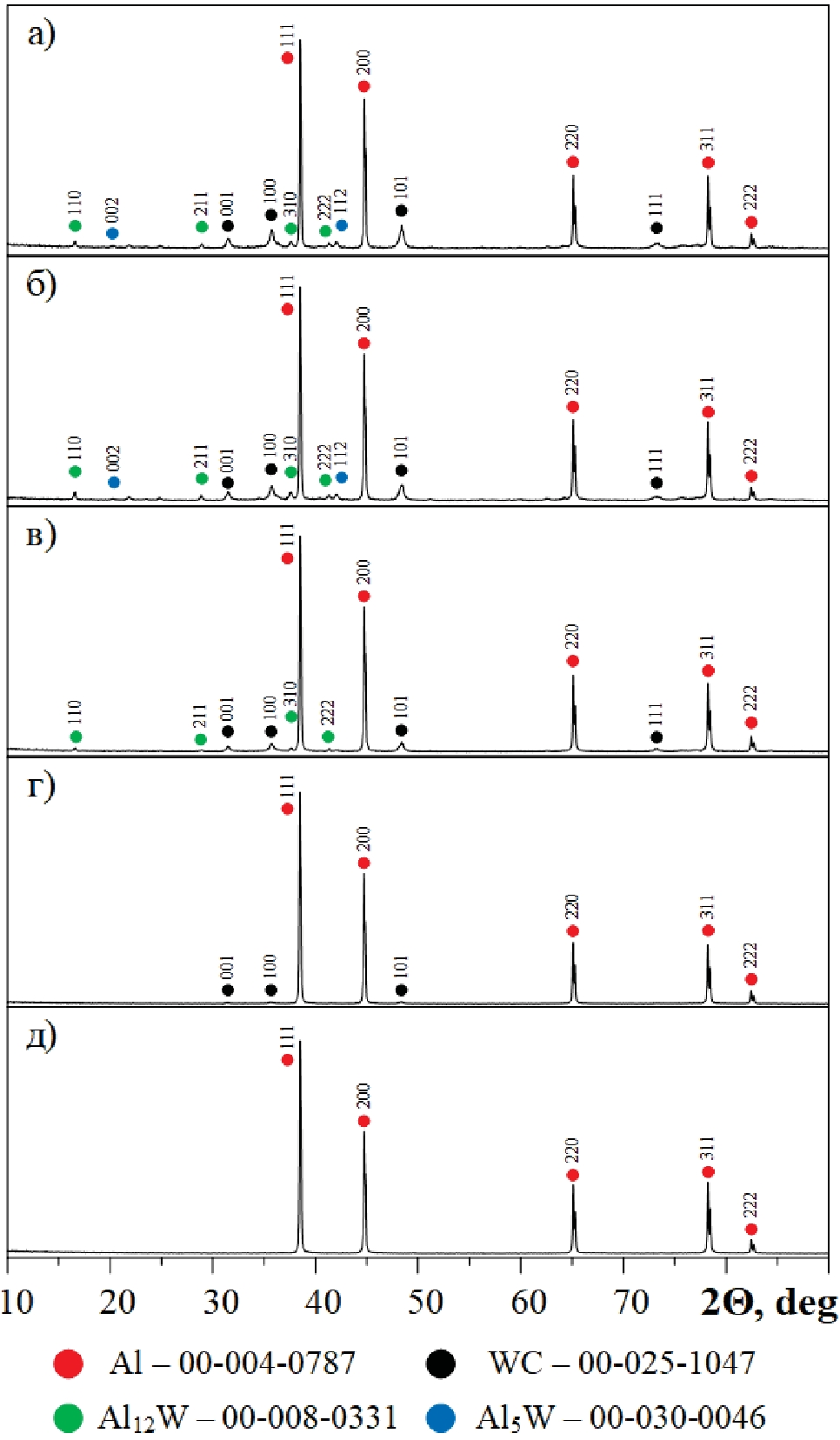 Рис. 4. Рентгеновские дифрактограммы композитных материалов с Al-матрицей при разном массовом содержании карбида вольфрама ω(WC), %: а) 15; б) 10; в) 5; г) 1; д) 0