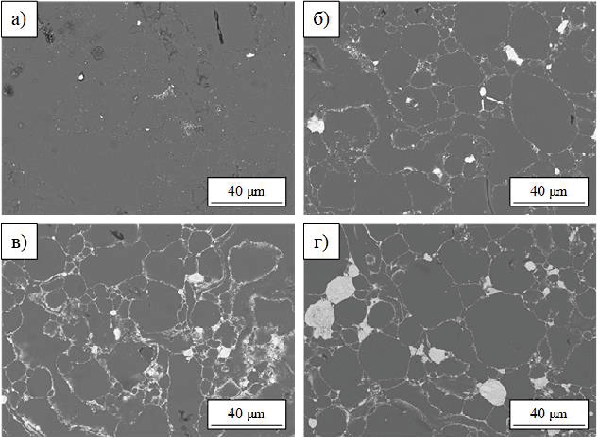 Рис. 5. SEM-снимки поверхности объемных композитных материалов с Al-матрицей при разном массовом содержании карбида вольфрама ω(WC), %: а) 1; б) 5; в) 10; г) 15