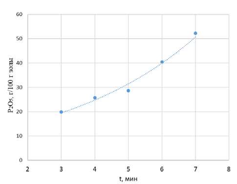 Установлено, что на протяжении 7 минут плазменной обработки куриного помета содержание Р2О5 в биоугле составляет более 50 %, что является хорошим показателем для дальнейшего производства удобрений или извлечения фосфора из биоугля. Полученные значения содержания оксида фосфора в биоугле после плазменной обработки помёта кур однородны по критерию Стьюдента и достоверны по критерию χ2 Пирсона. При обработке подстилочного куриного помета плазмой при температуре 1560 °С с повышением времени обработки (t, мин) содержание оксида фосфора (С(Р2О5), г/100 г биоугля) будет экспоненциально увеличиваться по зависимости с коэффициентом детерминации R2=0,98 (рис. 5):