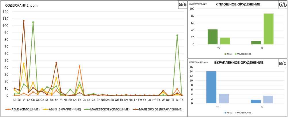 Анализ показал широкий спектр редких примесных элементов (рис. 2), среди которых одними из преобладающих по содержанию являются полуметалл теллур и металл висмут. При этом стоит отметить, что при сравнении содержаний данных компонентов в рудах для месторождения Абыз фиксируется преобладание Te (рис. 2, б), а для Малеевского – Bi (рис. 2, в).
