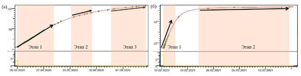 В случае отсутствия зоны ухудшенной проницаемости (рис. 2, а) забойное давление растет практически с одинаковой скоростью, на графике при этом выделяется несколько прямолинейных участков (этапов). Первый прямолинейный участок фиксируется на протяжении полутора месяцев с начала исследования. Этот этап характеризуется равномерным беспрепятственным поступлением жидкости в скважину, после чего давление перестает увеличиваться с тем же темпом ввиду ограничения (штуцера), вызванного, по всей видимости, областью ухудшенной проницаемости, расположенной на достаточно удаленном расстоянии от скважины. После того, как 29.05.2023 давление в двух областях стабилизировалось, рост забойного давления вновь продолжается (этап 2), но уже с меньшим темпом. В дальнейшем в пласте вновь возникает некоторое сопротивление, после которого на этапе 3 давление снова растет с постоянным темпом. Временные периоды нелинейного роста забойного давления между выделенными этапами соответствуют перераспределению давления между зонами в пласте. На рис. 2, б, в сравнении с рис. 2, а, наблюдается высокий тем роста забойного давления в течение первых трех дней (этап 1) с начала исследования. Этому явлению соответствует очень небольшая зона ухудшенной проницаемости вокруг скважины, за которой расположена зона с высоким давлением, в результате чего забойное давление уже в течение недели (этап 2) достигает значения пластового давления.