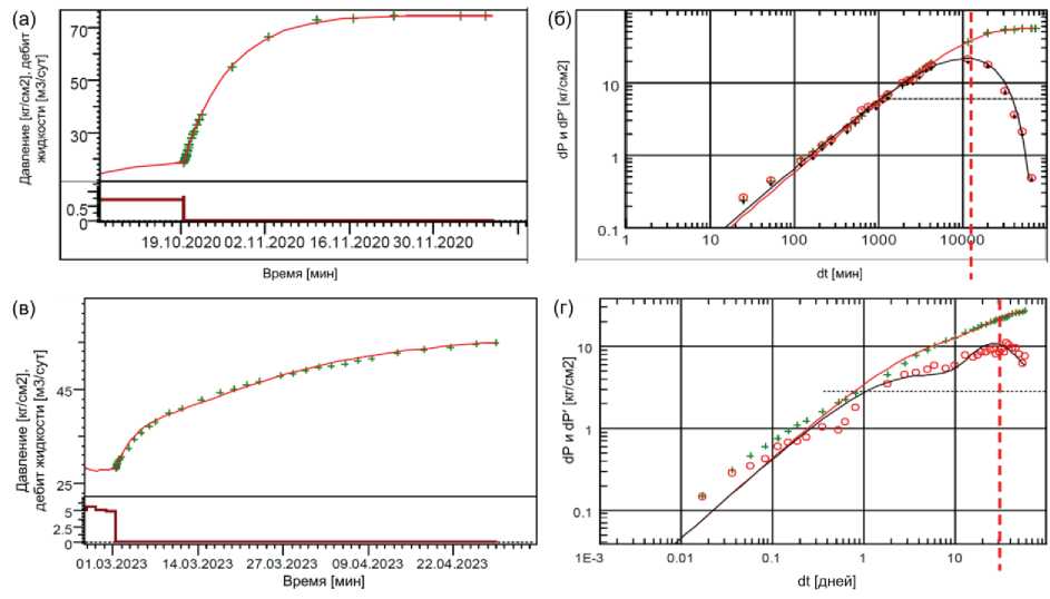 Приведем пример работы с данными ГДИ по одной из нефтяных залежей в башкирских отложениях С2b (средний карбон) на юге Пермского края. На скважине в ноябре 2020 г. были проведены исследования до обработки (рис. 4, а, б) и в марте 2023 г. после обработки (рис. 4, в, г).