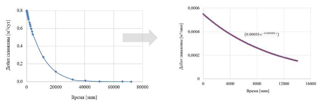- Строится график изменения дебита с момента начала исследования до момента перегиба производной и определяется функция, аппроксимирующая данные исследования.