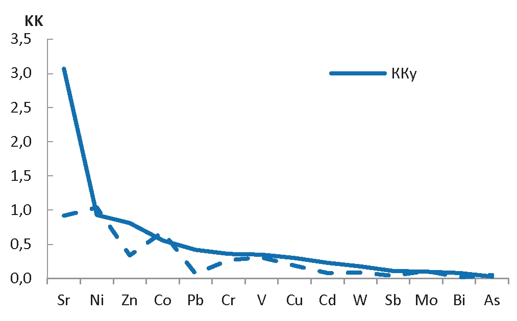 В качестве топлива для Центральной ТЭЦ и котельных Северобайкальска используют бурые угли Канско-Ачинского бассейна, их зольность составляет 6–12 %, теплотворная способность 2800–3800 ккал/кг. Результаты химического анализа Канско-Ачинских углей показали, что они обогащены лишь Sr3.1 (нижний индекс – значение ККу), обладающим высокой углефильностью; содержание остальных ТММ ниже кларковых значений (рис. 2). По сравнению со среднемировыми значениями зола Центральной ТЭЦ обеднена ТММ, лишь для Ni ККз=1,0. Наибольшие коэффициенты выноса в атмосферу установлены для Pb (Kатм=16) и Bi (15). В углях с содержанием Pb, близким к кларковым значениям, преобладает органическая форма поллютанта, которая при сгорании полностью испаряется и выбрасывается с дымовыми газами [24]. Минимальный коэффициент Катм=1,9 отмечен у As, что может быть обусловлено нахождением As в Канско-Ачинских углях преимущественно в силикатной форме, в результате чего поллютант задерживается в шлаке [24].