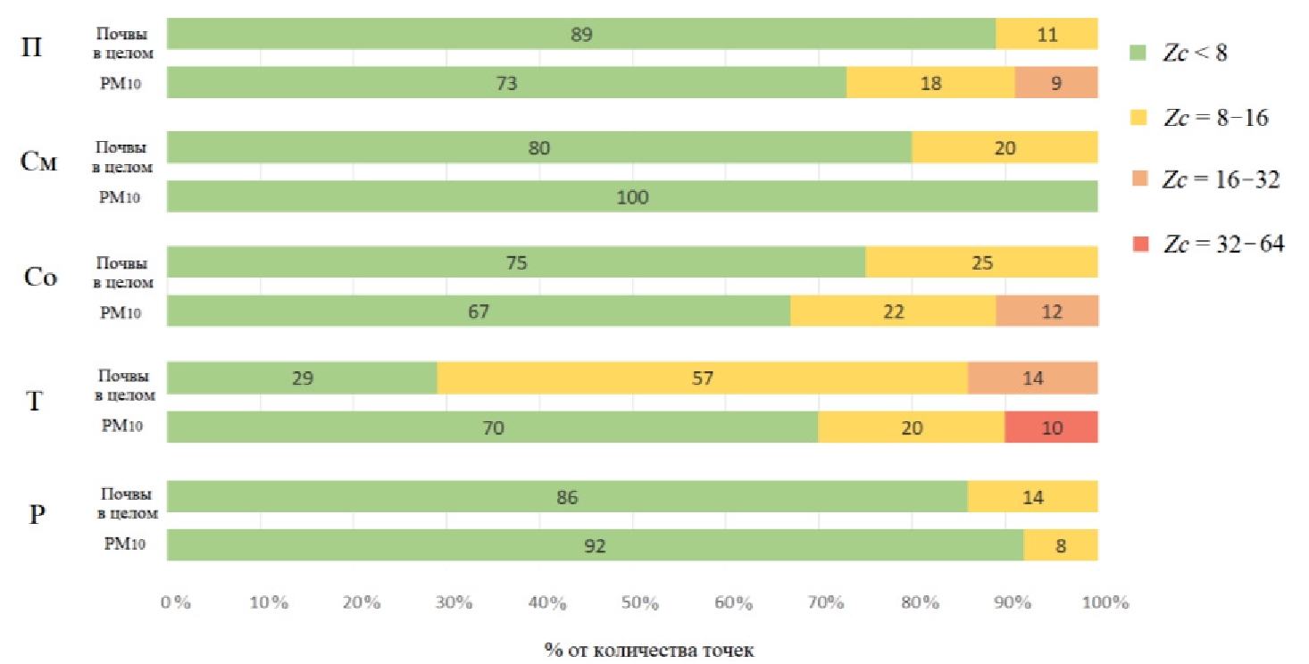 В почвах Северобайкальска не обнаружено превышения содержания ТММ над гигиеническими нормативами. Во фракции PM10 почв наибольшую экологическую опасность представляют Pb и Zn, нормативы которых превышены на 5 и 8 % территории. Средний суммарный уровень загрязнения городских почв и фракции PM10 соответствует низкому, неопасному уровню (Zc=6), максимальные значения Zc=8,5 для почв в целом и Zc=9,3 для фракции PM10 зафиксированы в транспортной зоне.