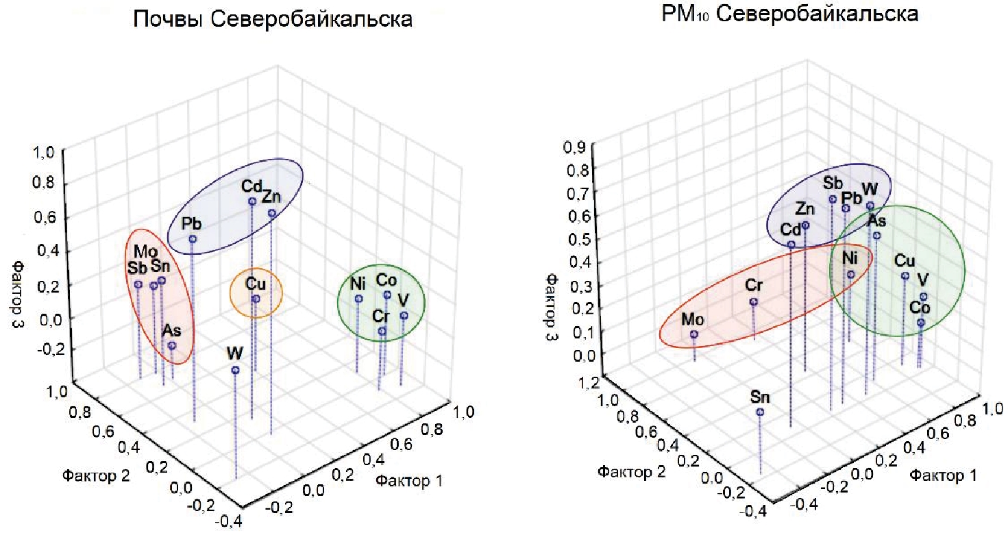 Наибольшее влияние на микроэлементный состав городских почв и частиц PM10 оказывают выбросы железнодорожной инфраструктуры и сжигание угля на Центральной ТЭЦ (доля объясняемой дисперсии 24 % для почв в целом и 48 % для фракции PM10), что вызывает активную аккумуляцию в почвах As, Sb, Mo, Co, Ni, Cu, V. При сжигании Канско-Ачинских углей на Центральной ТЭЦ происходит концентрирование ТММ в золе-уносе: содержание V, Mo, Co, Ni и As возрастает в 5,6–8,7 раза, а Sb и Cu – в 2,7–3,7 раза по сравнению с исходным топливом. Осаждение содержащихся в золе-уносе поллютантов приводит к дальнейшей концентрации элементов в верхних горизонтах почв, где концентрация Sb увеличивается 4,3 раза, а V, Cu – в 1,7–2,0 раза по сравнению с золой-уносом. Фракция PM10 почв обнаруживает еще более интенсивное относительно золы-уноса обогащение Sb (в 4,6 раза), V, As и Cu (в 1,4–3 раза).