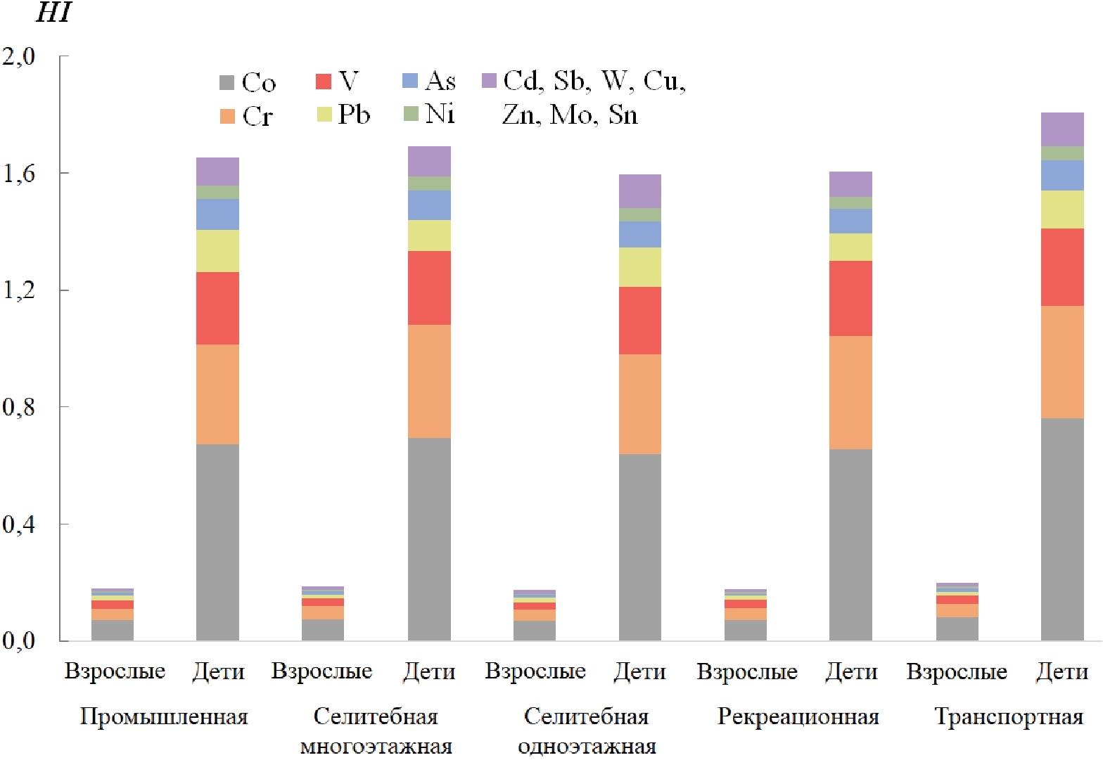 Сумма индивидуальных HQ, определяющая индекс опасности HI, не превысила безопасное пороговое значение 1 во всех функциональных зонах г. Северобайкальска для взрослого населения, что подтверждает низкий потенциальный неканцерогенный риск попадания в организм ТММ, содержащихся в частицах почвы (табл. 3). Для детей значения индексов HI в среднем составили 1,6, наиболее высокое значение (HI 1,8) выявлено в транспортной функциональной зоне, что соответствует опасному риску и требует дополнительного контроля (рис. 6). Дети, по сравнению со взрослыми, значительно более подвержены воздействию ТММ в силу своих поведенческих и физиологических особенностей [56–58]. Однако стоит отметить, что постоянное присутствие детей вблизи железной дороги и сопутствующей инфраструктуры маловероятно. Наибольший вклад в HI для взрослых и детей во всех функциональных зонах г. Северобайкальска вносят Co, Cr, V, Pb, As и Ni. Доля, приходящаяся на сумму остальных ТММ (Cd, Sb, W, Cu, Zn, Mo и Sn), составляет менее 7 %.