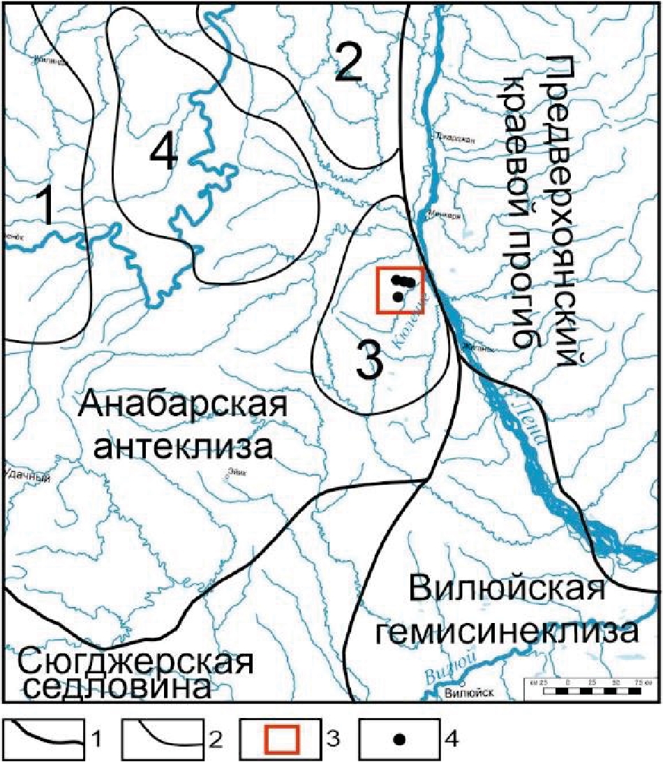Fig. 1. Overview map of the study area [15]. Borders of structures: 1 – supra-order, 2 – I order; 3 – study area; 4 – studied sections. Structures: 1 – Anabar mega arch, 2 – Olenyok arch, 3 – Mun arch, 4 – Sukhan depression