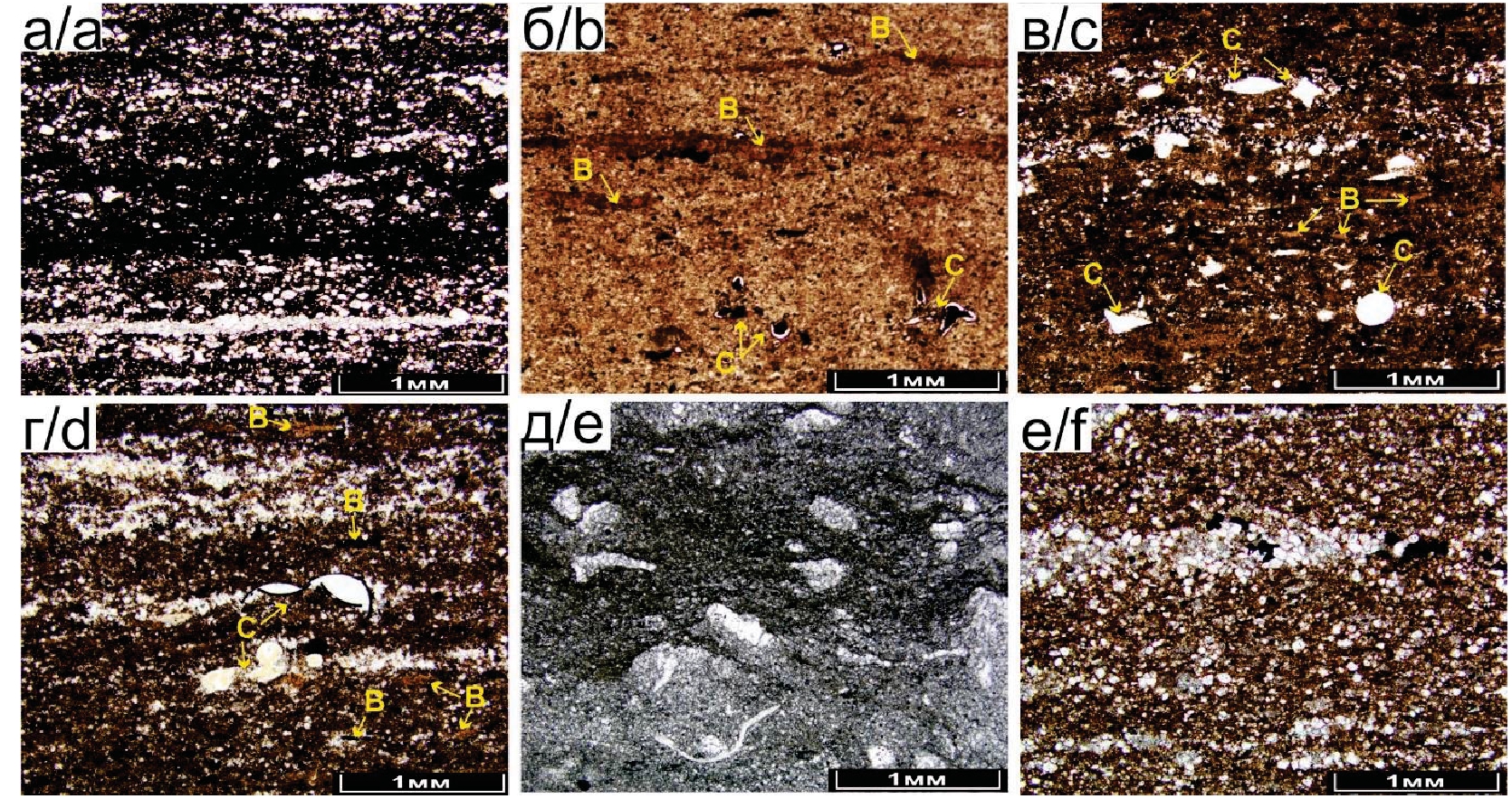 Рис. 3. Основные типы пород куонамской свиты: а) кремнисто-глинистая слабо карбонатизированная порода с высоким содержанием Сорг. (7 %) и нечеткой микрослоистостью (бороулахский горизонт); б, в) силициты с детритом кремниевых организмов (С) и бактериально-водорослевыми остатками (В). Примесь карбонатного материала 1–5 %, содержание Сорг. 6–8 % (нижняя пачка амыдайского горизонта); г) глинисто-карбонатно-кремнистая порода с содержанием Сорг. 5 %, послойной концентрацией карбонатного материала, бактериально-водорослевым и фаунистическим детритом (верхняя пачка амыдайского горизонта); д) известняк микрокристаллический с редко рассеянным скелетным детритом (малокуонамский горизонт); е) глинисто-кремнисто-карбонатная порода с микролинзовидной слоистостью за счет обособлений карбонатного материала в глинисто-кремнистой матрице, обогащенной ОВ (Сорг. 3 %, маспакыйский горизонт)
