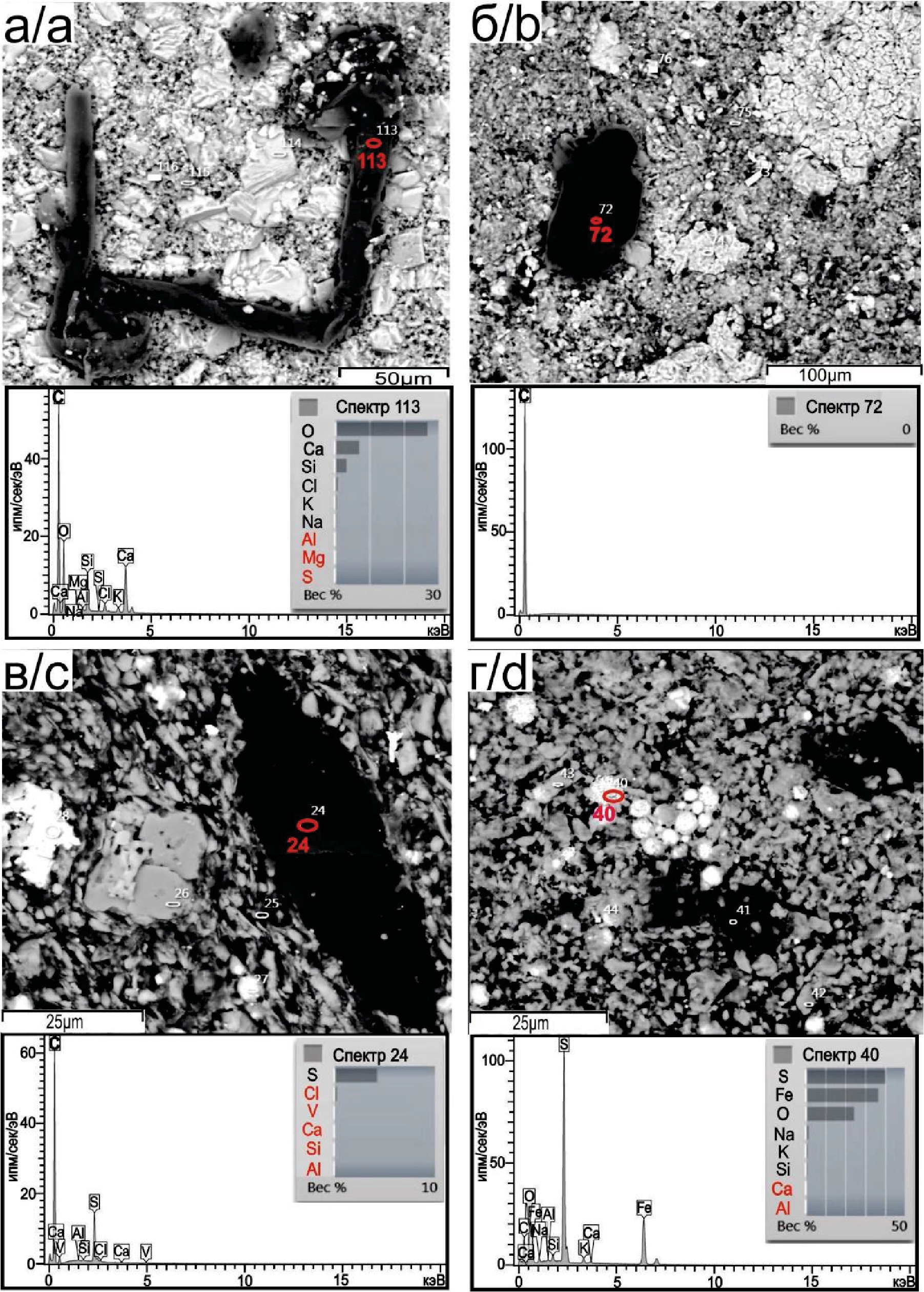 Fig. 5. Оrganic matter (images in the BSE with the results of X-ray spectral microanalysis): a) well-preserved filiform fragment of cyanobacterial plankton; b) carbonized remnant without admixtury elements; c) lenticular segregation of colloalgenite; d) finely ground cyanobacterial detritus in association with framboidal pyrite