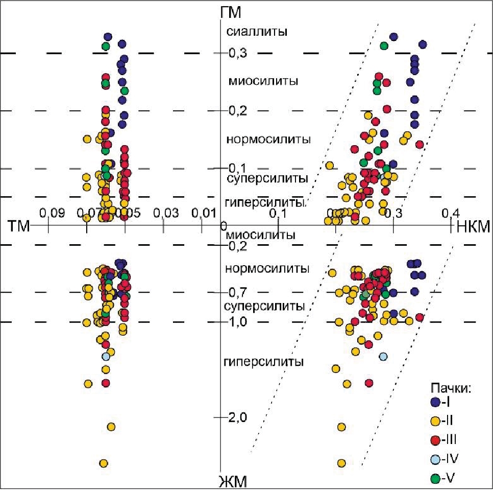 Для уточнения минералогического состава и условий седиментации куонамской свиты использовались петрохимические модули [18]. На рис. 6 приведены сводные диаграммы петрохимических модулей, на которых видны вариации в химическом составе пород различных пачек. Карбонатные породы Я.Э. Юдович выделяет в отдельный тип карбонатолитов, однако с помощью гидролизатного модуля можно оценить состав силикатной примеси в этих породах.