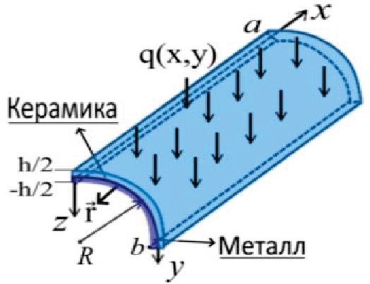 Рис. 1. Расчетная схема цилиндрической панели – фрагмента замкнутой цилиндрической оболочки