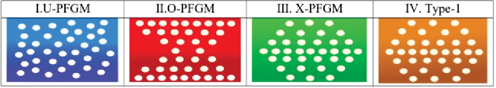 Пористость и градиентность материала панели определены с помощью степенных функций [25]: равномерная пористость (U-PFGM (I)), повышенная пористость от верхней и нижней поверхностей к центру (O-PFGM (II)), уменьшенная пористость от верхней и нижней поверхностей к центру (X-PFGM (III)) и тот же самый тип распределения пористости, в котором пористость и градиентность определены с помощью тригонометрических функций [26] (type 1 (IV)). Иллюстрация типов пористости маетриала приведена на рис. 2.