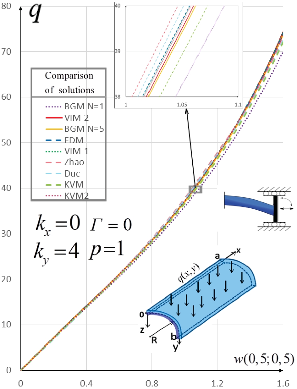 Метод Бунова–Галеркина (Bubnov-Galerkin method – BGM) в первом приближении является одним из наиболее широко используемых методов для анализа ФГ цилиндрических панелей и оболочек. Данный метод использовался при анализе ФГ цилиндрической панели при осевом сжатии [6], при исследовании ФГ двоякоизогнутых несовершенных неглубоких оболочек из композита, армированного углеродными нанотрубками [7], при анализе тонких оболочек в задачах динамики с учетом демпфирования под действием механических нагрузок [8]. Данный метод также применялся в работе [9] при анализе нелинейного отклика ФГ цилиндрических панелей при равномерном боковом давлении с учетом температурных эффектов и в работе [10] для исследования нелинейных динамических характеристик и свободных колебаний ФГ пористой усечено-конической панели. Аналитические выражения с применением процедуры BGM для получения явных выражений и соотношений между нагрузкой и прогибом для ФГ плоских и цилиндрических панелей, подверженных термомеханическим нагрузкам, опирающихся на упругие основания, представлены в [11, 12]. Отметим, что в указанных работах BGM использовался в первом приближении, что является приближенным решением и содержит большие погрешности. Данный метод также использовался при изучении влияния косых ребер жесткости на нелинейное статическое и динамическое поведение цилиндрических панелей [13] и при анализе характеристики свободных колебаний и нелинейных откликов цилиндрических панелей [14].