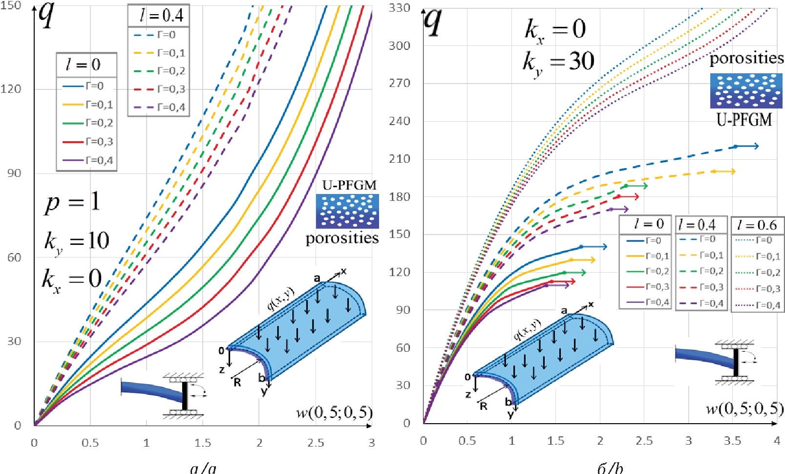Увеличение параметра кривизны приводит к качественному изменению зависимости q[w(0,5;0,5)] и при ky=30 для цилиндрических панелей происходит потеря устойчивости. При этом при увеличении размерно-зависимого параметра до l=0,6 потери устойчивости не наблюдается. Увеличение показателя пористости Г и размерно-зависимого параметра l приводит к возрастанию величины критической нагрузки при потере устойчивости.