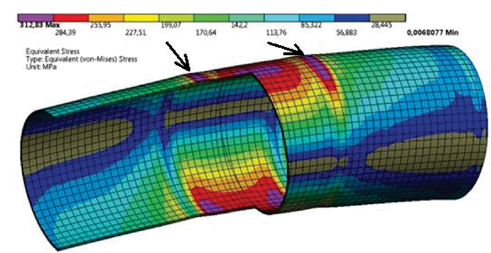 Прежде всего, следует обратить внимание на то, что в незащищенной бетонным покрытием стыковой зоне обетонированного трубопровода при изгибе максимальные значения полей напряжений локализуются на границах этой зоны (границы стыковой зоны обозначены стрелками на изображении конечно-элементной сетки) (рис. 1). Причем максимальные значения напряжений на границах значительно превышают номинальные напряжения в стенке трубы обетонированного трубопровода.