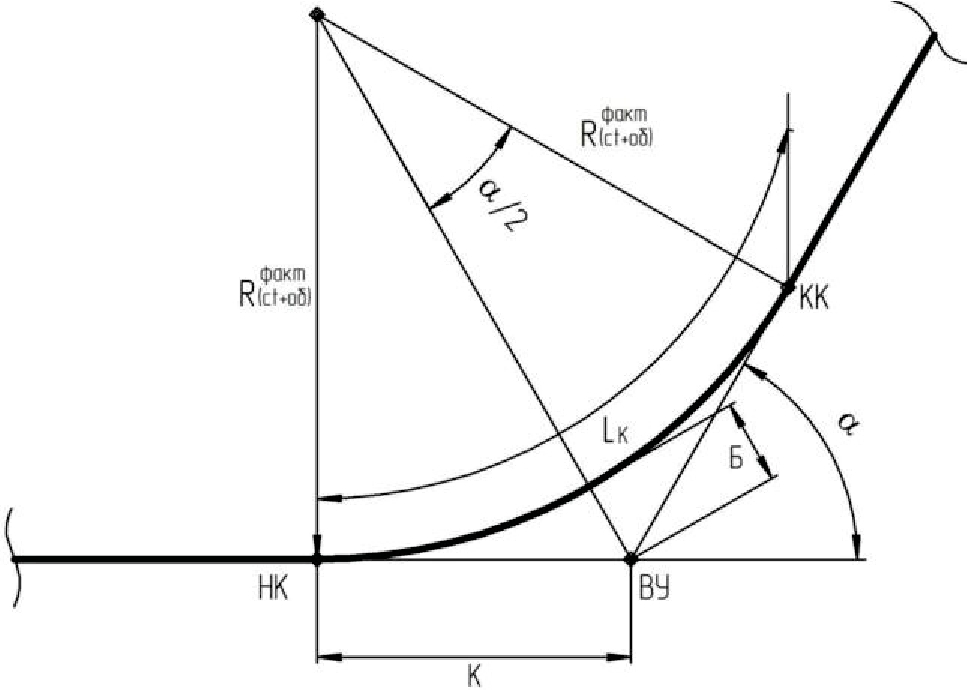 Fig. 2. Parameter of a bend: НК – beginning of the curve; КК – end of the curve; ВУ – angle vortex