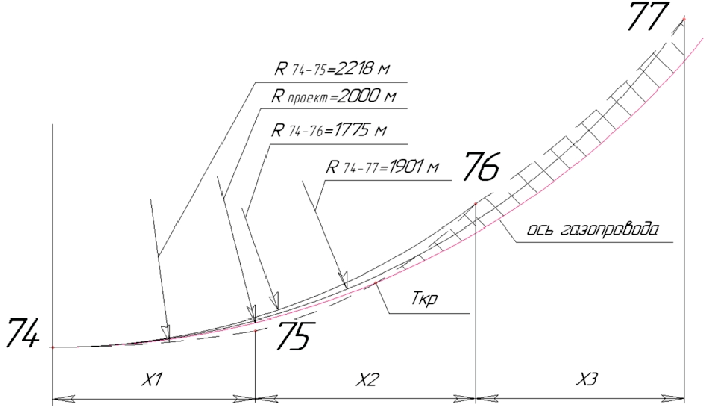 Фактическое положение точки «77» соответствует дуге окружности, проходящей через точки «74» и «77», с радиусом изгиба 1901 м, что не отвечает условию